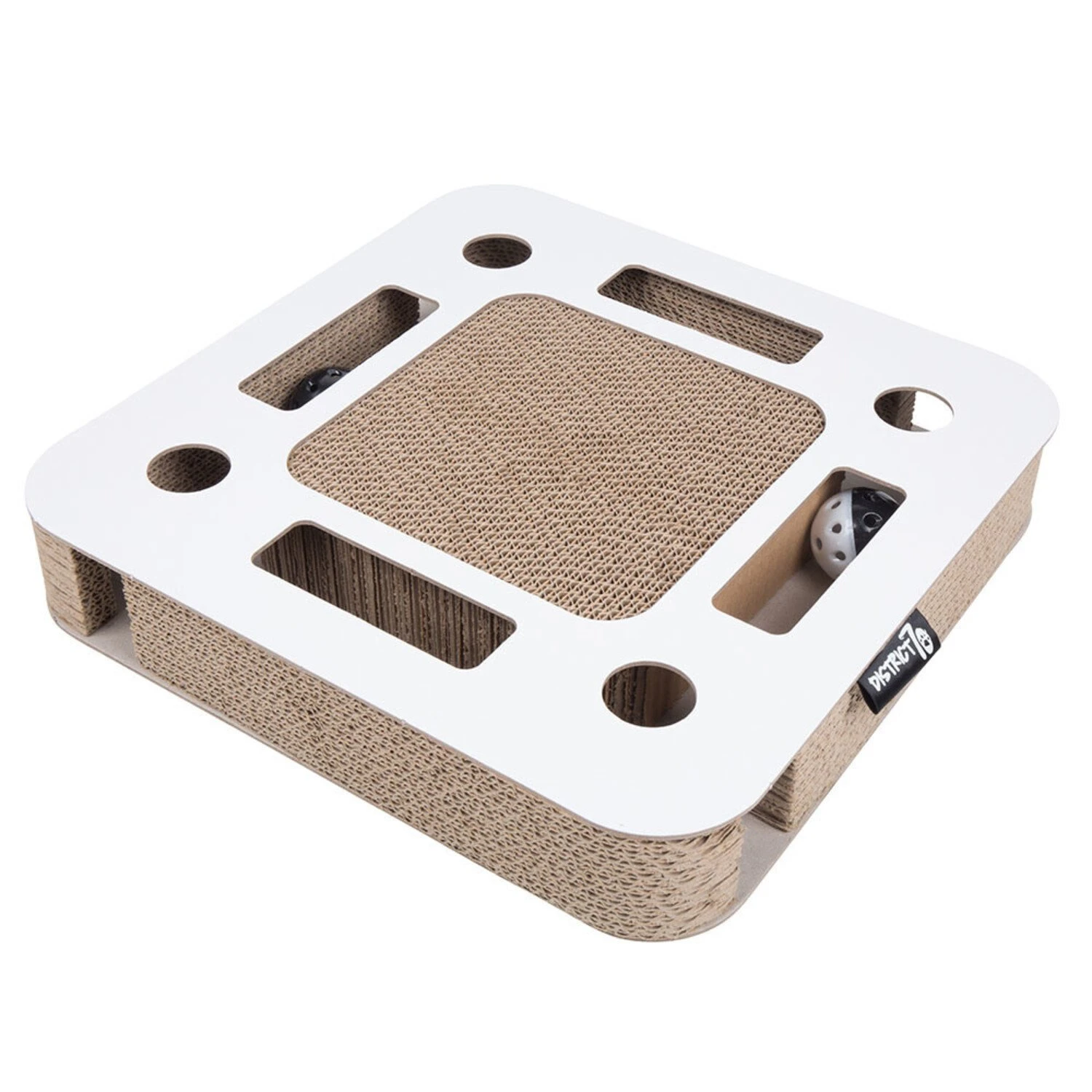 De krabplank SPY van het merk District 70 is een multifunctioneel product. Het is een krabplank en speeltje in 1, er zitten namelijk verschillende speelgoed ballen met geluid in deze krabplank verwerkt. Hierdoor zal je kat naast het krabben ook veel plezier beleven aan het spelen met dit artikel. Het product is gemaakt van stevig karton op alle hoeken en zijkanten, afgewerkt met een houten plaat aan beide kanten. Het krabartikel kan in twee kleuren worden geleverd: wit en zwart.