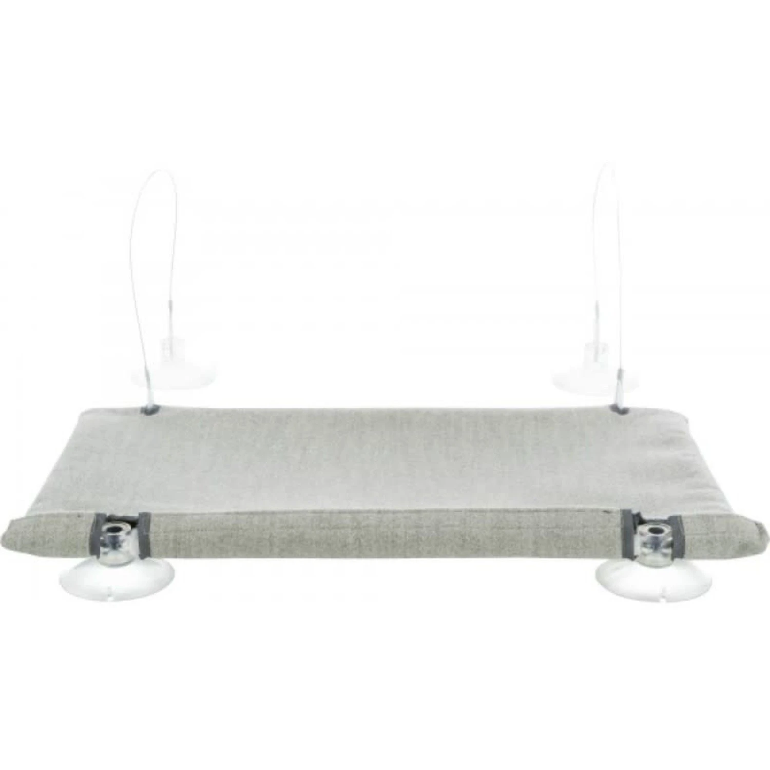 Het grijze doek is afneembaar en bevat aan de binnenkant een stevig metalen frame en 2 stevige metalen draden zodat de hangmat recht aan het raam kan hangen.
