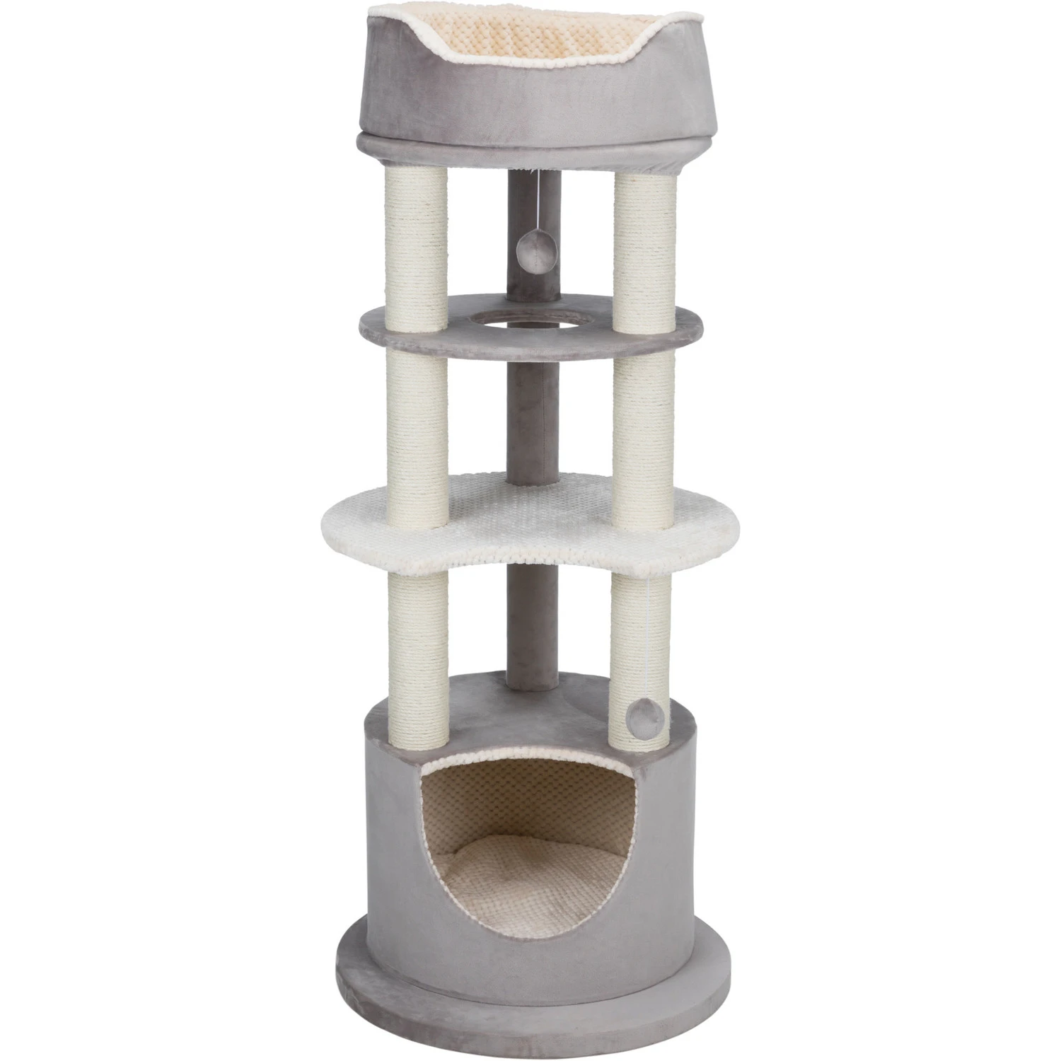 Deze rechte hoge toren krabpaal heeft onderaan een schuilplaats die binnenin bekleed is met een zachte pluche structuur en een los kussen wat op de handwas kan. Helemaal bovenop zit een ligplateau met een afneembare relax mand. Deze mand kan op de handwas gewassen worden.
